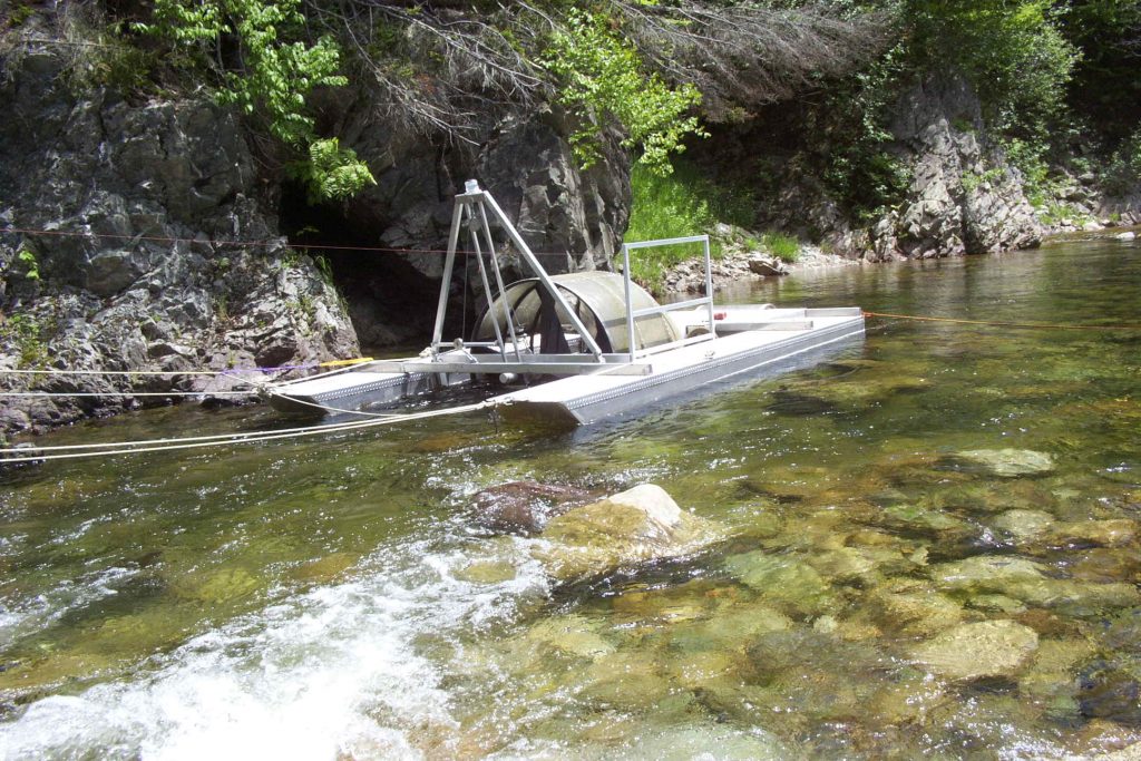 Secondly, in-river live gene banks are maintained in the river environments using fertilized eggs in incubation baskets, juveniles, and some adult fish from the captive breeding plan. Juveniles mature in the natural environment, but are captured in the spring after the smoltification process that scientists believe imprints their natal river and prepares them for salt-water exposure.   A rotary screw-like trap called a smolt wheel is positioned near a river barrier so fish attempting to migrate are, instead, safely funnelled into a cage for transport to Mactaquac.