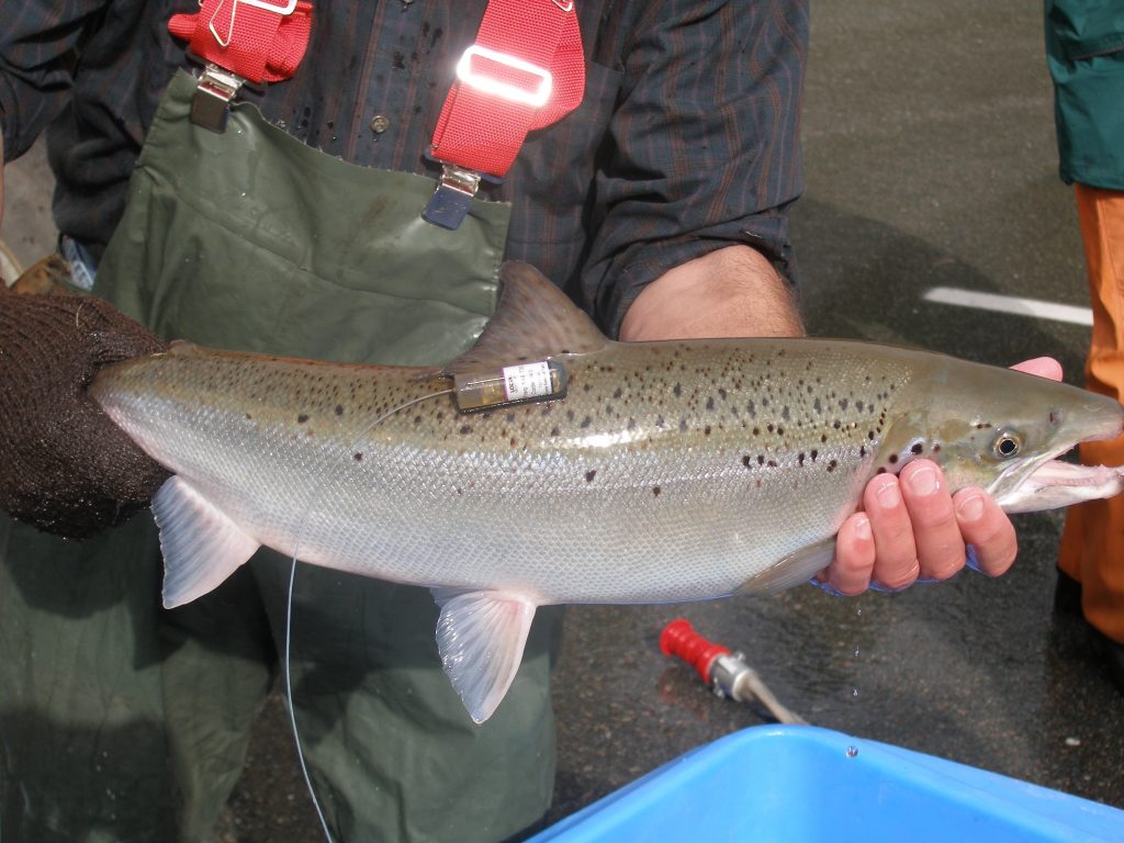 Location transmitters affixed to salmon. (Photo copyright © Deborah Carr)
